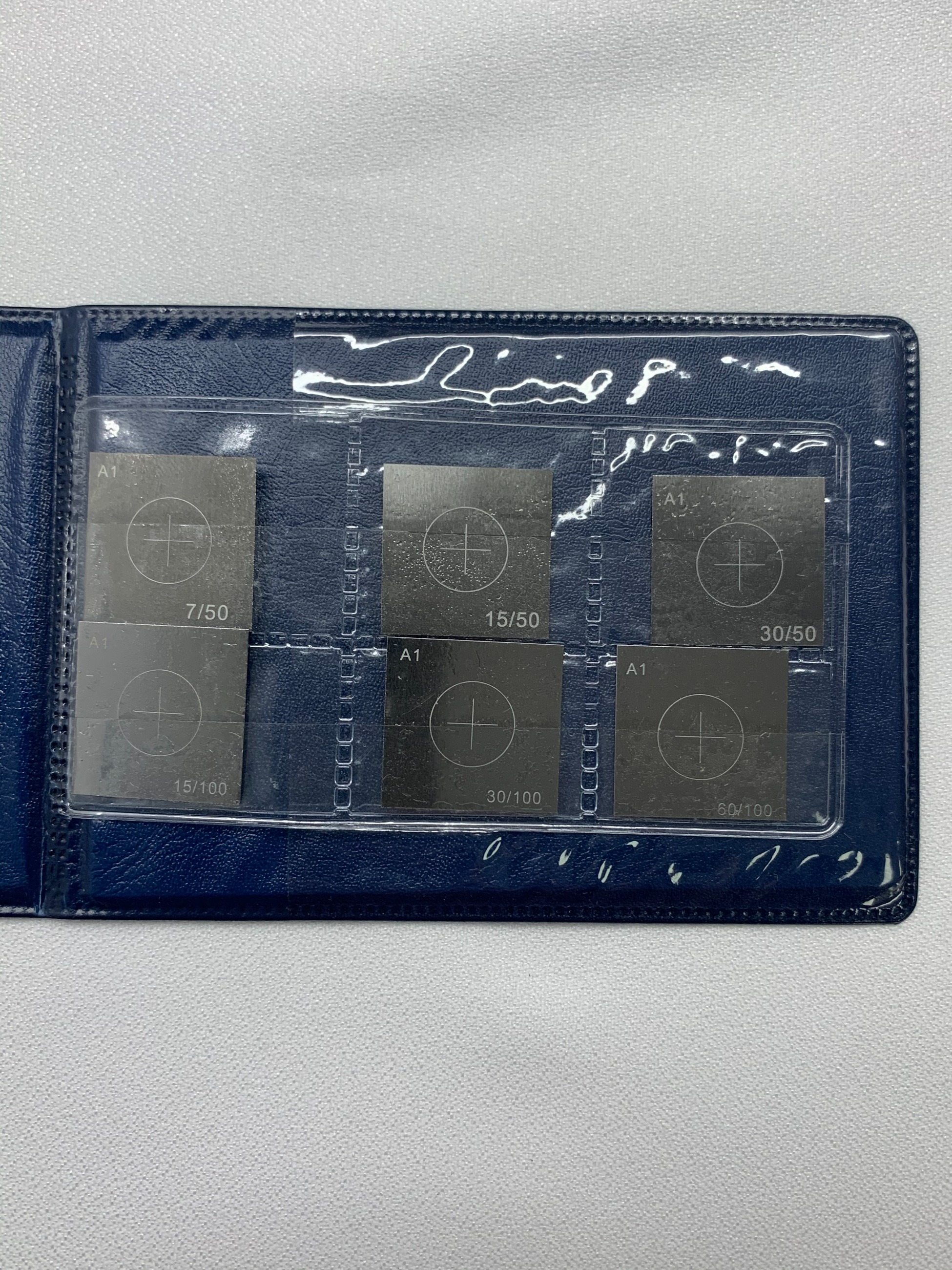 A型標(biāo)準(zhǔn)試片分為A1、A2;A1為退火材料制成,A2為不作熱處理的冷軋材料制成。本試片按JB4730-2005標(biāo)準(zhǔn)特別注明A1試片,與日本JISG0565-6標(biāo)準(zhǔn)和美國ASME SE709標(biāo)準(zhǔn)相對應(yīng)。本試片為A1 (15/50μ)標(biāo)準(zhǔn)試片。相當(dāng)于A1型試片中2# (30/100μ)標(biāo)準(zhǔn)靈敏度試片,規(guī)格為(8-9)D;適用于中靈敏度探傷,其中括號中分子為槽深,分母為試片厚度,單位為(微米),D為工件直徑。